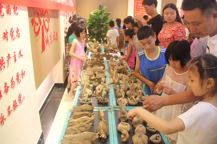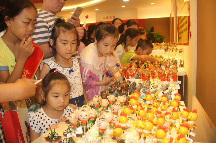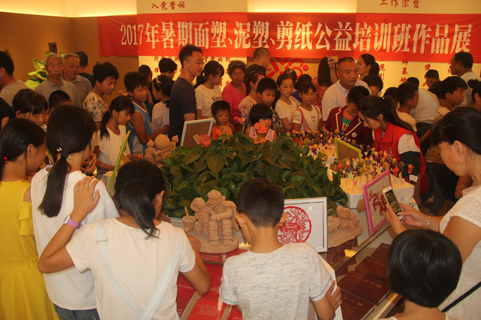 动态类的展演令人回味无穷,静态类展示也让观众耳目一新。看,在授课老师的指导下,经孩子们的慧心巧手,一张张普普通通的纸张,剪成了一幅幅窗花、墙花、花朵、小动物、人物等美丽图案;一块块随处可见的小泥巴,塑成了不同类型的泥塑作品:诸如代表努力的拳头、代表开心、胜利的yeah手势、寓意孝道的守候、历史故事的重现,以及日常家禽、动物、植物等,尤其是那个握拳的手,不但五根手指大小、长短把握刚刚好,握成的拳头所体现的寓意也催人上进,发人深思;面粉、糯米看似平常,经孩子们的捏、搓、揉,形成了一个个形象各异,惟妙惟肖的面塑作品:爸妈孩子组成的三口之家、唐僧师徒、两个挑水喝的和尚、三个没水喝的和尚、小猫小狗等当下受小朋友追捧的卡通形象等。有的家长边拿手机不停地拍边不停地赞叹“怎么能捏得这么像呢!跟真的一样!”,有的家长欢喜得让孩子拿着自己的作品一起拍照留影,骄傲之情溢于言表,有的家长把孩子搂在怀里,骄傲地说“女儿你真棒!”有的家长则拍拍孩子肩膀,激动地说“儿子,不赖啊!”听着爸妈的夸赞,孩子们更是得意的不得了:“告诉爸爸(妈妈),以后每年我都要参加这种培训班!”“好!”爸爸(妈妈)用力不停地点头。