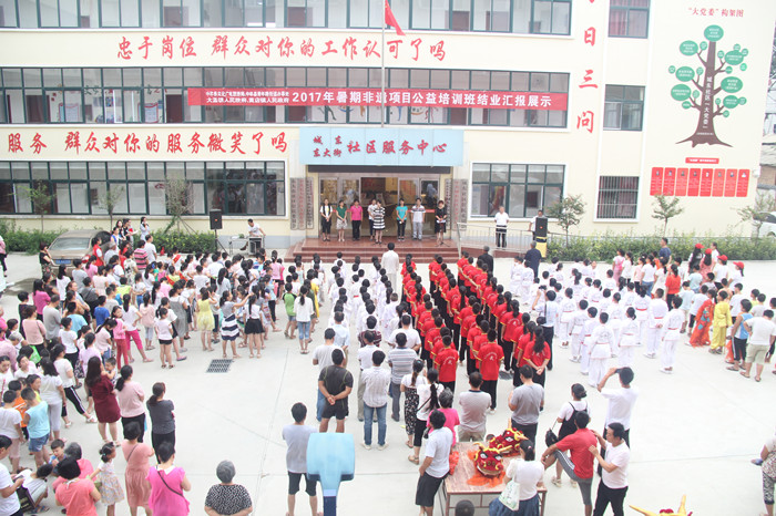 紧接着大吕武术的学员们排着整齐的队伍、身着统一的武术服装,在教练穆文山、穆增社、穆进兴的带领下霸气上场了!听着孩子们铿锵有力的“哼!哈!”武术之声,看着孩子们如行云流水、似蛟龙腾空的一招一式,社区观众的眼球瞬间就被吸引了过去,听到孩子们“扑通”摔地的表演声,惊呆了四周围观的孩子,孩子和家长齐声拍手叫好。不少群众纷纷说“文化局搞的这个非遗培训班真不赖!现在的孩子,学点特长,心灵手巧,比只会坐在教室抱着书本好!”