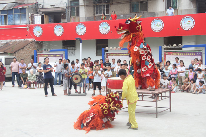 看,在鼓、锣、镲的齐声伴奏中,黄店镇的麒麟舞首个登台了。几个7、8岁和11、12岁的小学生头戴麒麟套、麒麟尾,随着伴奏乐曲的轻、重、缓、急,表演有模有样,活灵活现地把麒麟的活动过程以及喜怒哀乐情绪传达给观众。大麒麟奋力和把式对抗,PK,上高台表演时,扮演麒麟尾的孩子高高举起扮演麒麟头的孩子,动作技术惊险高超;旁边欢喜的小麒麟也玩得不可开交,随心地在地上打滚、贴耳亲昵、围追打闹,一下子把观众带入了开心、快乐、无忧无虑的意境中。虽然学习时间不长,在整体气势方面略有不足,对麒麟的个别情绪把控也不是很到位,但孩子们的精彩表演还是赢得了观众的阵阵掌声。