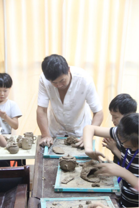 在中牟县文化艺术中心泥塑课堂正在进行泥拖鞋制作教学,王金海老师挨个指导,学生们兴趣盎然;香包课堂上,林深花老师带领大家穿针引线,前来负责安全教育的家长们也融入其中,培训班成了亲子班;传统戏曲老师张喜亮则更开心,因为这次招收的学生里面有几个很有灵气的,“一教就会,知道往哪使劲,嗓子也很好,培养培养,将来能成才”,张喜亮笑呵呵的说。