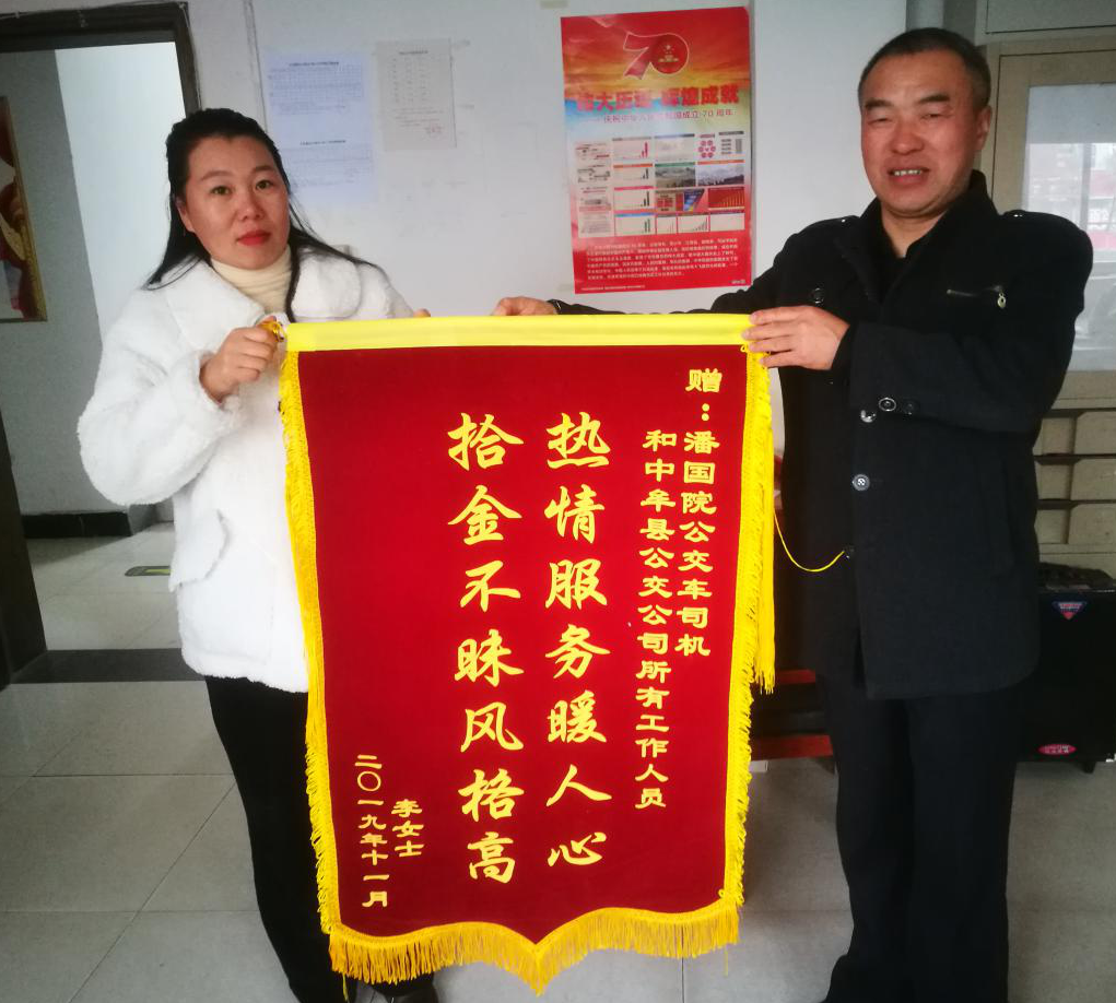 11月22日上午,李女士将一面印有“热情服务暖人心,拾金不昧风格高”的锦旗送到中牟城乡公交客运有限公司办公室,以表达他对1路公交车司机潘国院的感激之情。