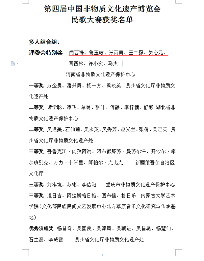 第四届中国非物质文化遗产博览会民歌大赛获奖名单