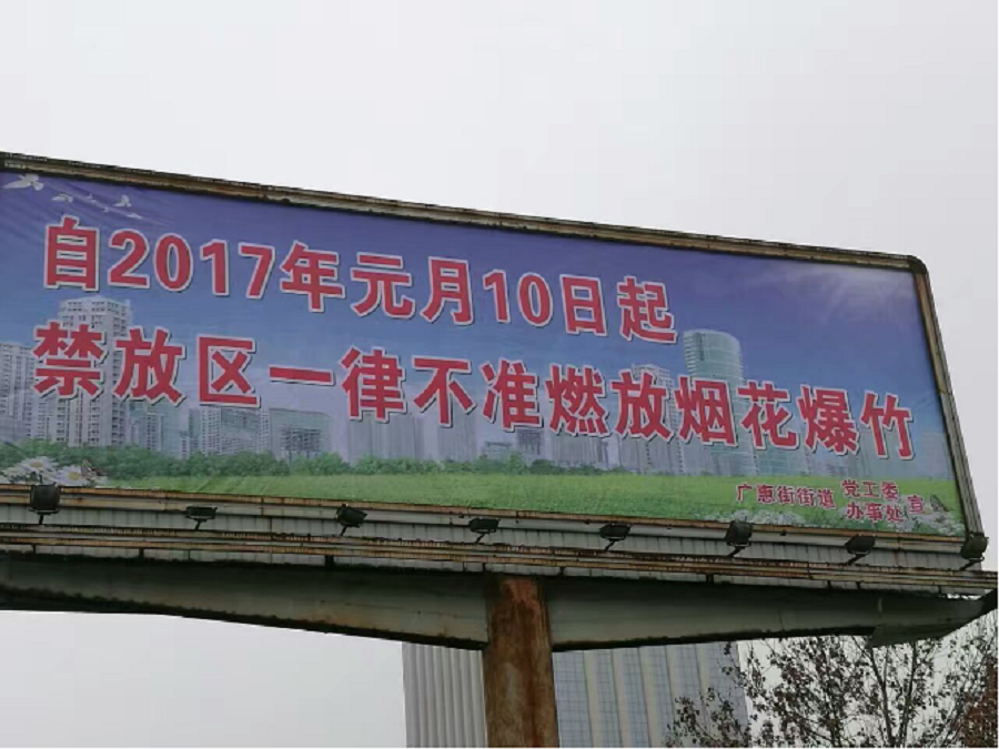 广惠街街道紧跟市县步伐,积极响应市政府烟花爆竹禁放命令,多方面、全方位宣传,大力推动烟花爆竹禁放工作。禁放工作开展以来,全街道群众家喻户晓,积极配合,基本达到了烟花爆竹零燃放的工作目标。