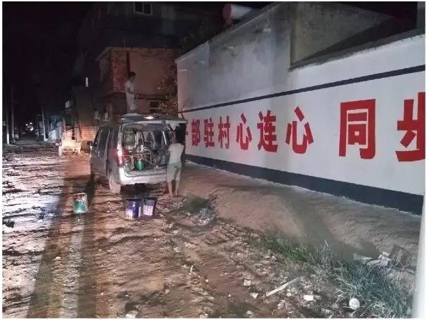 为加快工作进度,环卫中心工作人员连夜奋战,历时19个小时,共刷写“打好脱贫攻坚战,确保消除贫困户”、“精准扶贫,不漏一人”等5条标语。