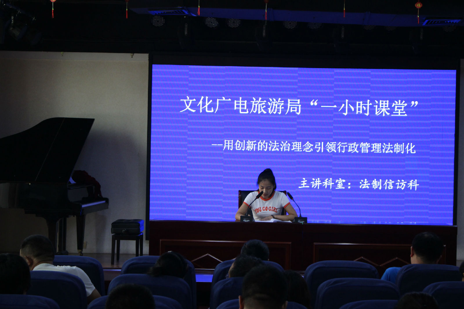 8月17日下午,中牟县文化广电旅游局“一小时课堂”由局法治信访科张会敏同志为干部职工做了一场“用创新的法治理念引领行政管理法制化”专题讲座。