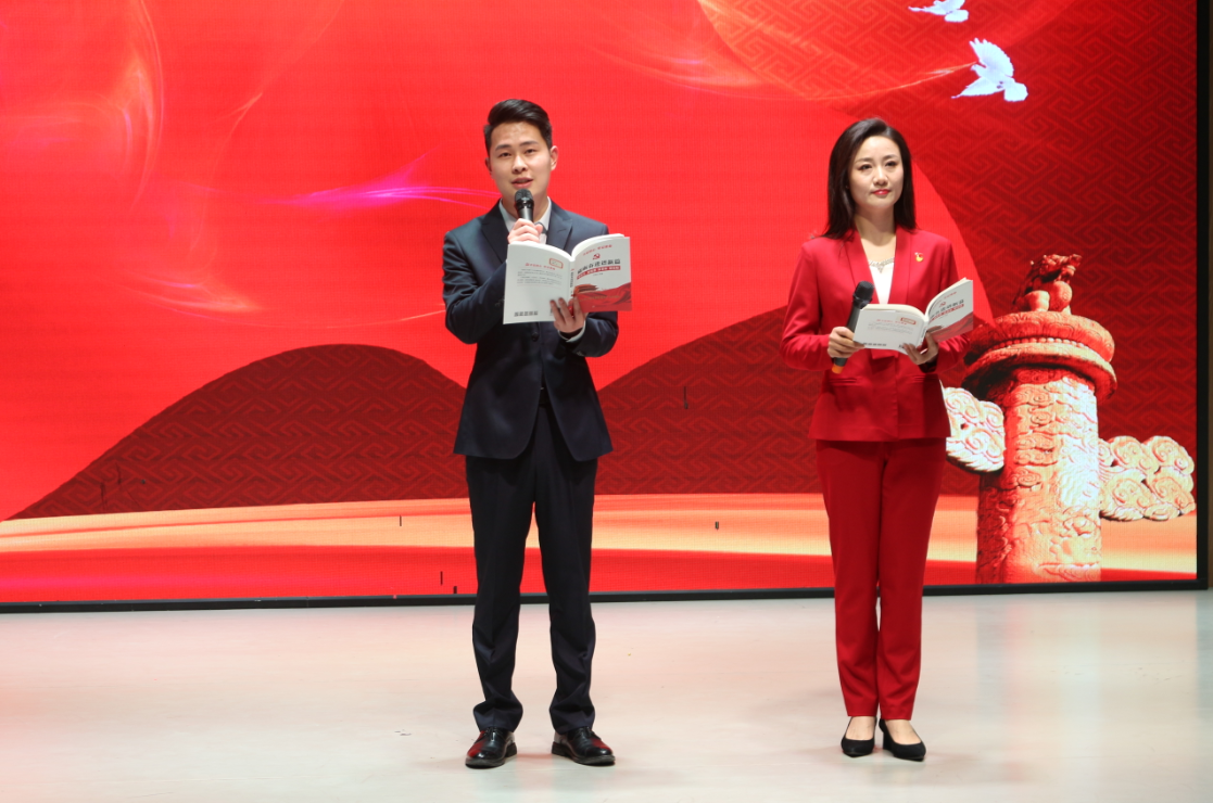 朗读者靳鑫、刘沛圆用饱含自豪、深情、激昂的语调朗读了《永远跟党走》。百年党史,波澜壮阔,蕴含着磅礴的力量和无穷的智慧。最后,所有朗读者和全体观众一起唱响《没有共产党就没有新中国》。