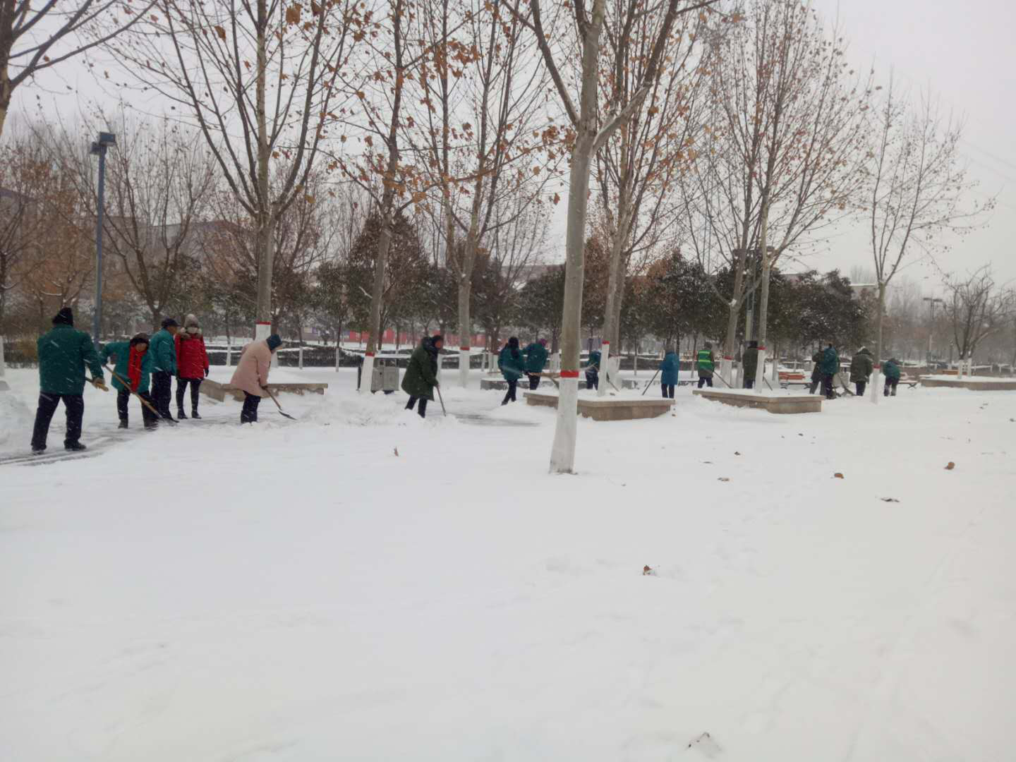 园林局组织绿化管理工作人员对公园、广场、游园的积雪进行清理,将公园、广场道路上的积雪一扫而光,保证各个公园、广场、游园的正常开放,守护游客出行安全。