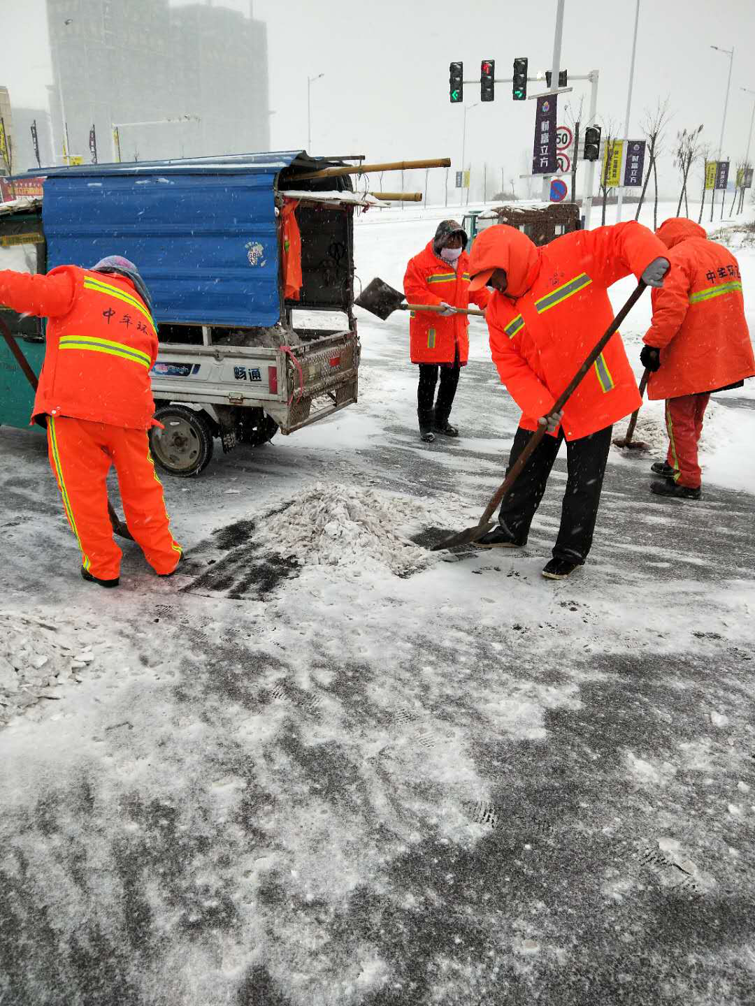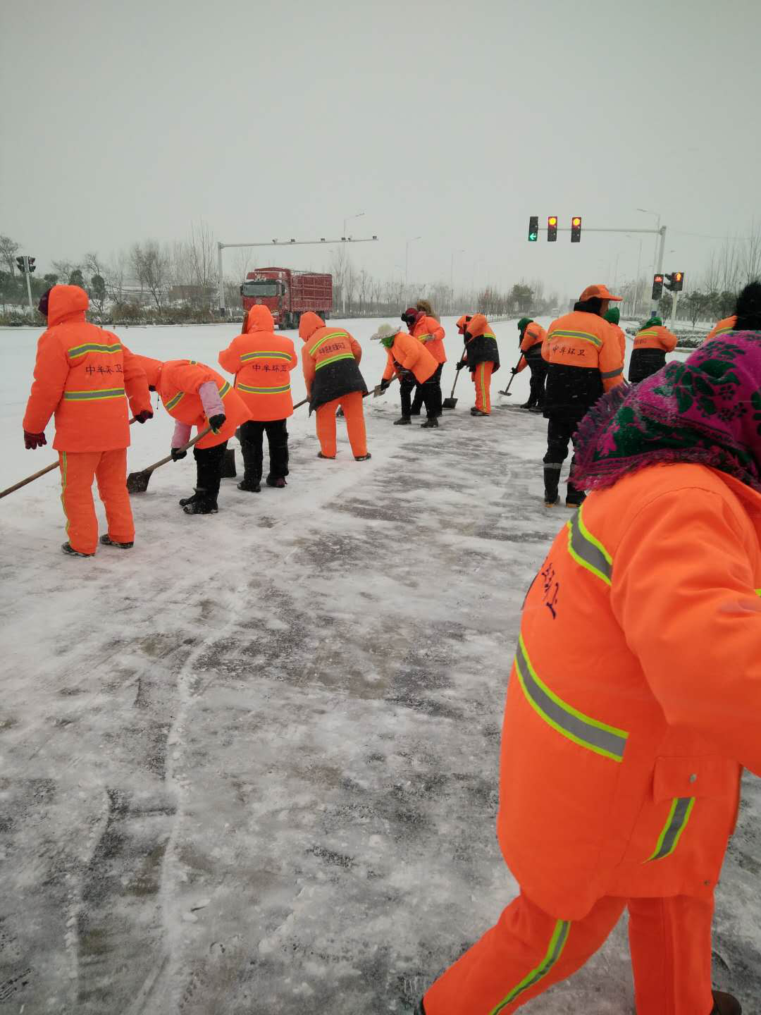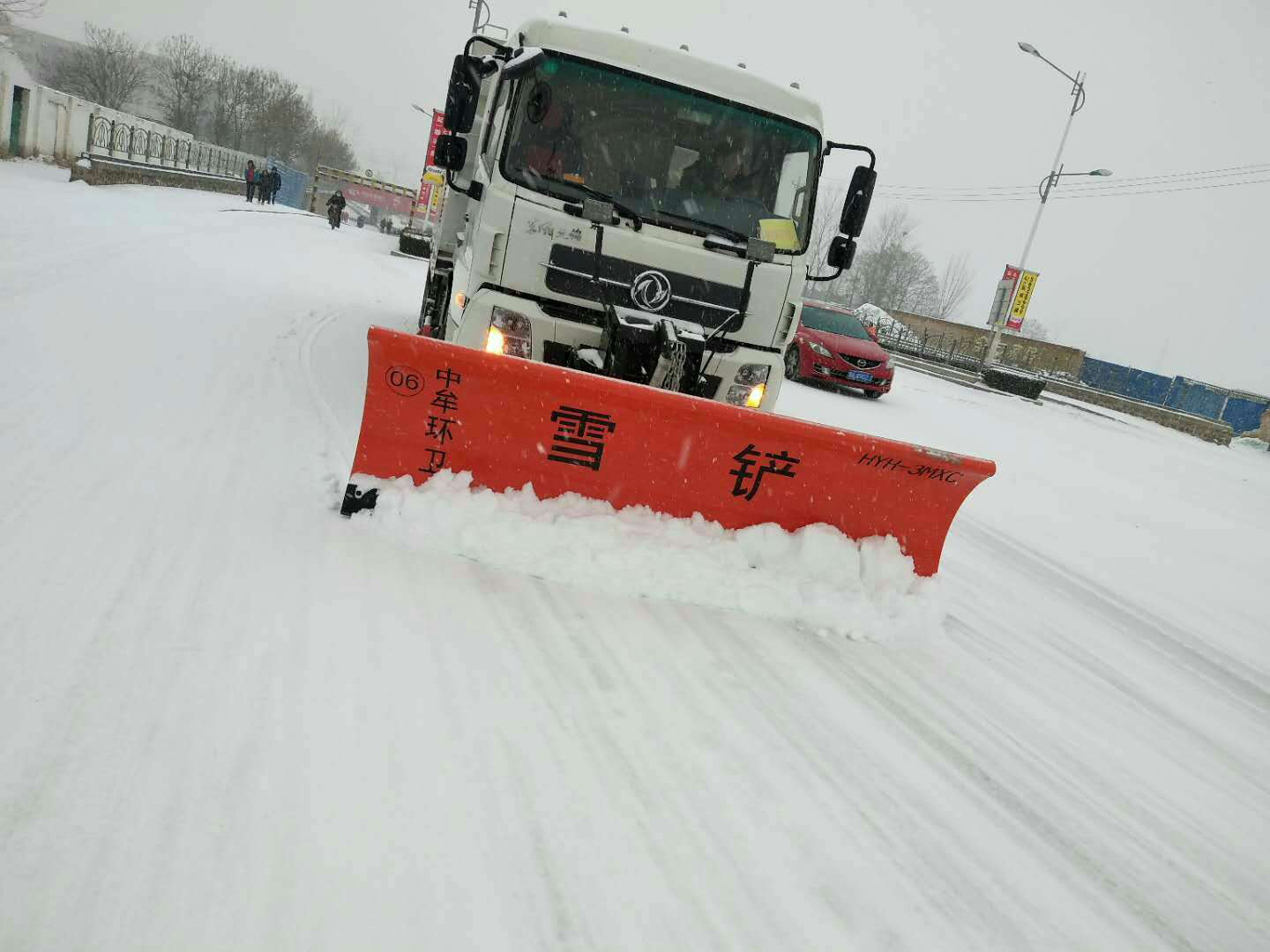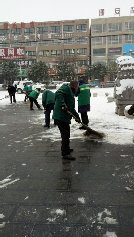 环卫大队紧急出动雪铲车7台,撒布机1台,按照先主后次的顺序对城区主次干道进行除雪,自6:00开始,1000多名一线保洁人员和单位人员对主次干道进行除雪。