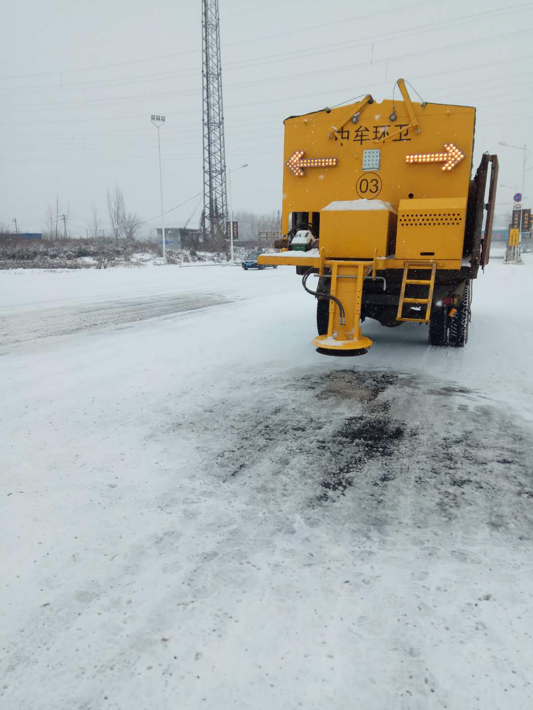 使用撒布机对道路洒除雪剂进行溶雪