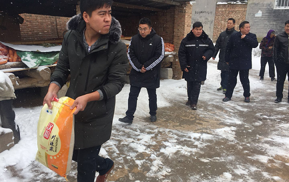 1月3日迎来了2018年第一场大雪,这场雪带来了阵阵寒意,而中牟县移民局的领导给万滩镇坡岗李村带来了爱的温暖。1月4日上午,下了一夜的积雪已经很厚了,路上车辆和行人很少。上午九点,两辆载满爱心和慰问品的汽车缓缓驶向坡岗李村。由中牟县移民局张宏伟局长带队,万滩镇司法所所长、包村干部、驻村第一书记龚占强、韩冰,村支书白小伍,村长郭晨戌等16人,深入到坡岗李村对贫困家庭、残疾家庭、孤寡老人家庭进行新年慰问,为每户送去了粮油、大米,同时也送去了党和政府对贫困人员的关爱。
