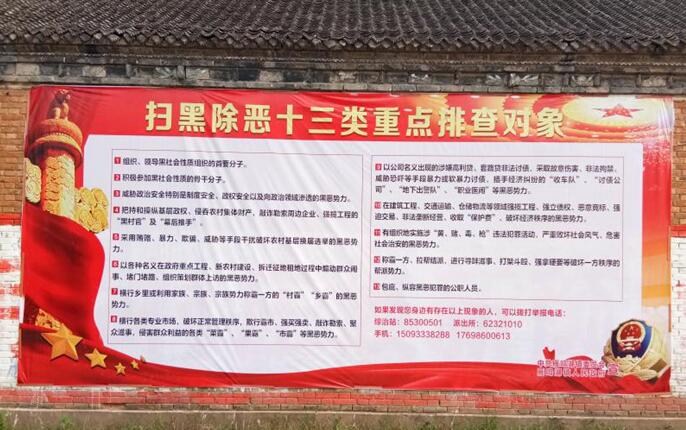“快看!这里挂上了扫黑除恶十三类重点排查对象的宣传版面,上面还有好几个举报电话”,近日,雁鸣湖镇在每一个行政村内醒目位置都悬挂了不低于20平方的扫黑除恶宣传版面,对十三类重点排查对象进行宣传,现在只要村民一进村,就会看到偌大的版面,也通过这种方式将扫黑除恶知识传遍了辖区每一个角落。