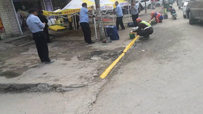 工作人员对占道经营进行清理整治并画出路沿石标识。