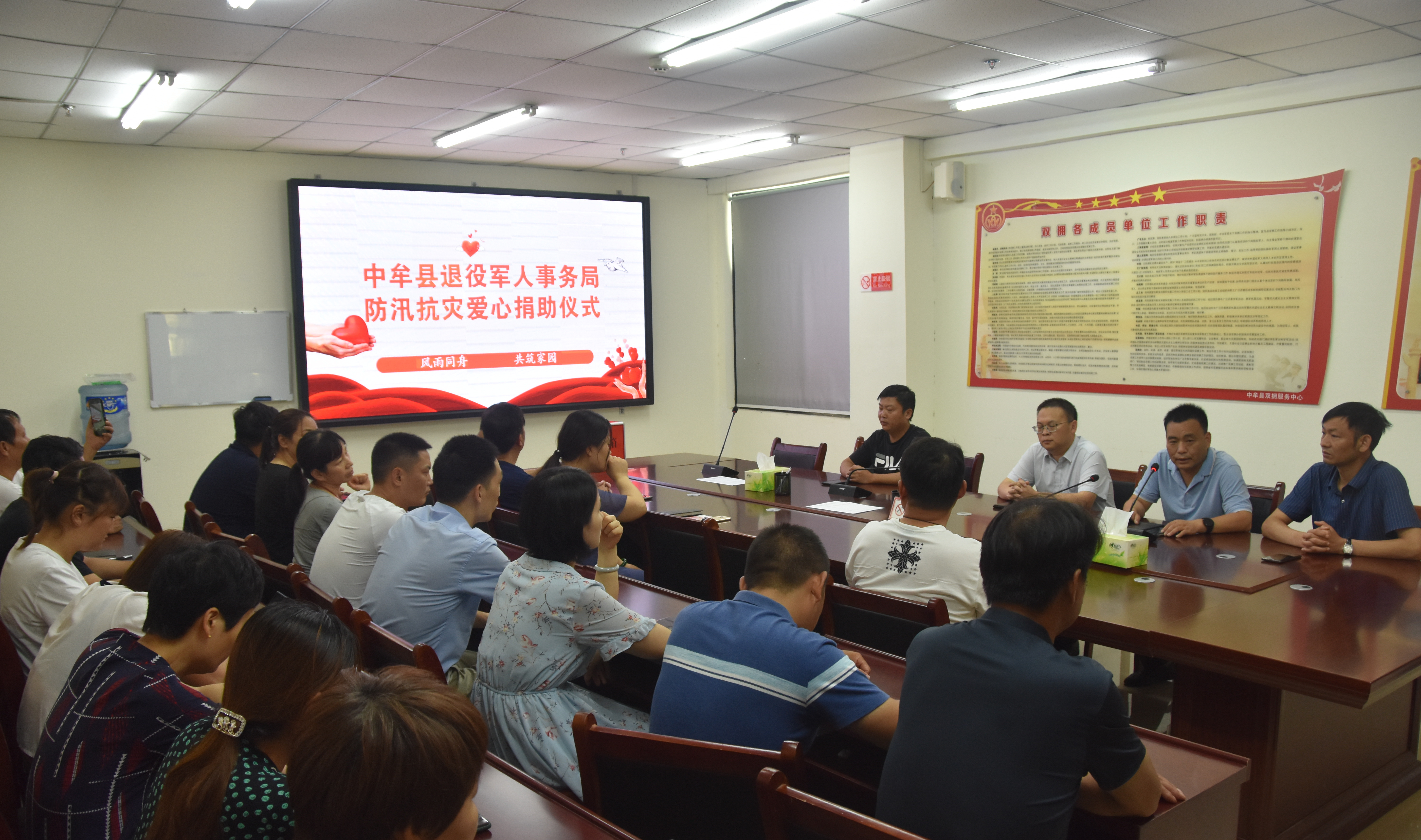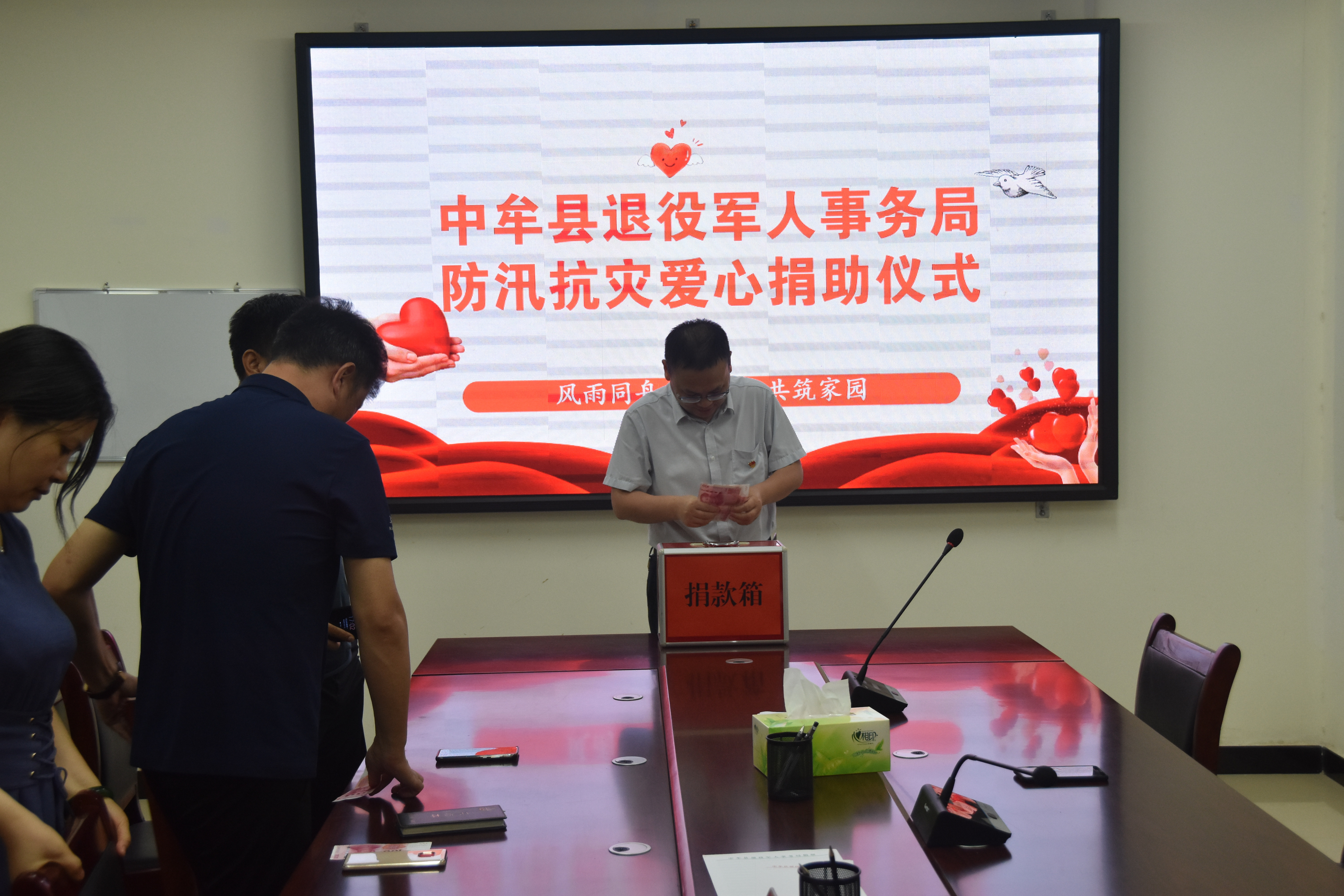 7月26日下午5点,中牟县退役军人事务局在机关四楼会议室举行防汛抗灾爱心捐助仪式。动员讲话后,在党组书记、局长周盾营的带头下,大家积极行善,踊跃参加,依次将自己的爱心投入捐款箱。
