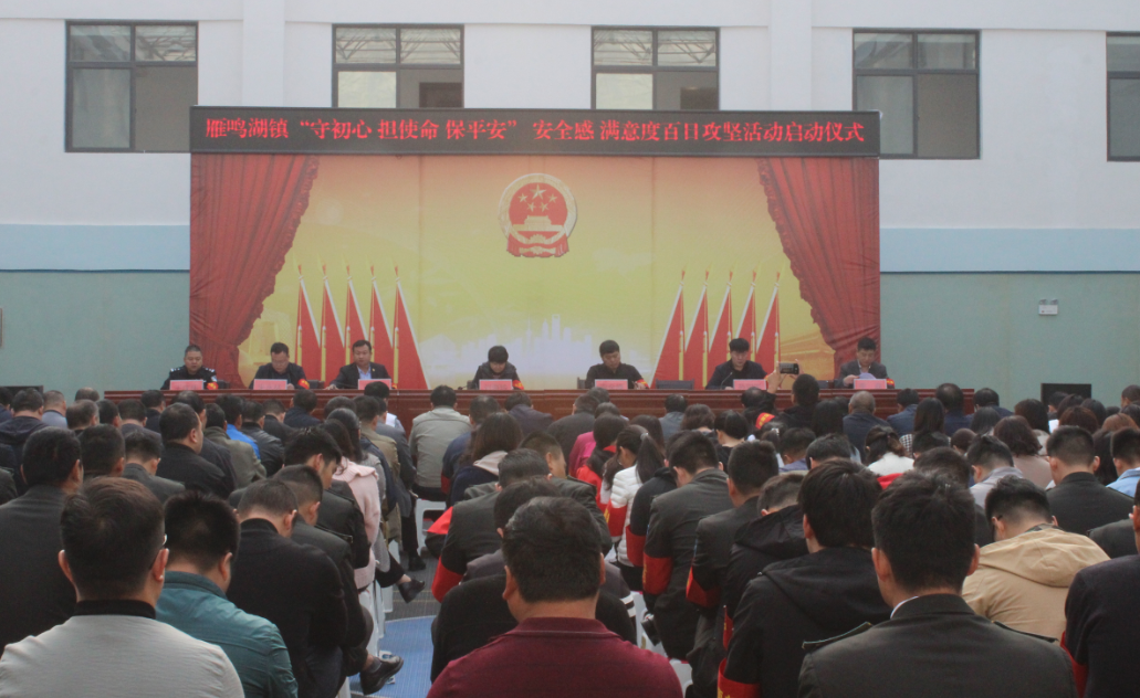 为了贯彻落实县委政法委深入推进平安建设、扫黑除恶工作,提升辖区群众安全感和满意度,雁鸣湖镇10月18日上午在镇政府文化服务中心举行“守初心、担使命、保平安”提升公众安全感和满意度百日攻坚活动启动仪式。机关站所负责人、各行政村支部书记、镇直单位负责人、企业负责人、综治工作站及全体巡消防队员、派出所民警等200余人参加了本次活动启动仪式。