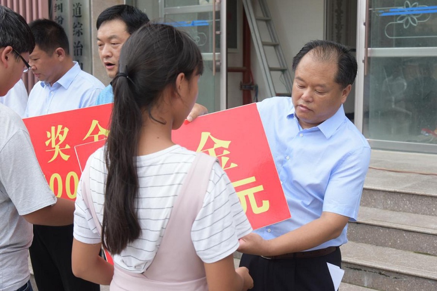 仪式上,万晓法主任宣读了奖励决定,对受奖励的学生进行了颁奖,学生代表和家长代表分别作了典型发言,最后,王书记介绍了我街道内辖区学校建设情况和经济社会发展情况,并针对受奖励的学生、家长、全体机关干部及村组干部提出了三点希望:一是希望今天受奖励的各位学子,常怀“五心”,即:对父母要有孝心,对帮助过你的人要有感恩心,对社会要有爱心,对学习要有恒心,对自己要有信心。同时,继续发扬艰苦奋斗、刻苦钻研求知精神,在新的起跑线上再创佳绩。二是希望家长同志们,做好三个榜样,即:在孩子们人生成长、习惯养成上做好榜样,在诚信友善、守法遵纪上做好榜样,在艰苦奋斗、发家致富中做好榜样。同时,积极融入全街道经济社会大发展的潮流中,紧紧围绕街道办事处的中心工作开展生产生活,理解发展、支持发展、参与发展。三是希望各村的村组干部们,做到一个坚决,即:坚决贯彻执行街道党工委、办事处出台的各项规章制度和部署的各项工作,勇于担当,敢于担当,以抓铁有痕、踏石留印的态度和行动,全力推动街道经济社会进一步发展。