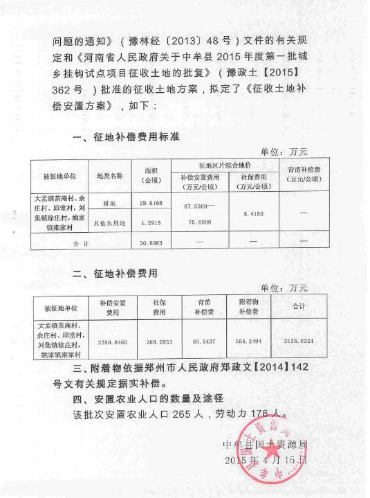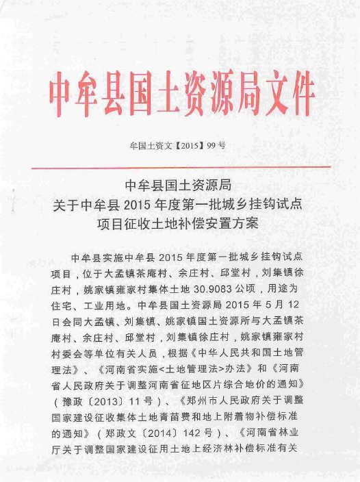 中牟县国土资源局关于中牟县2015年度第一批城乡挂钩试点项目征收土地补偿安置方案 牟国土资文[2015]99号