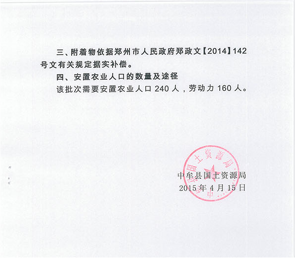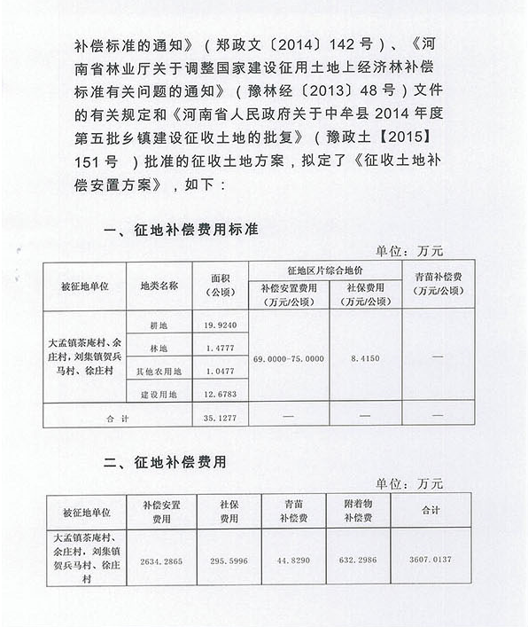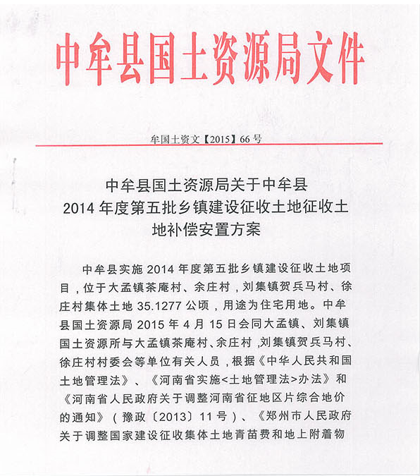 关于中牟县2014年度第五批乡镇建设征收土地补偿安置方案 牟国土资文[2015]66号