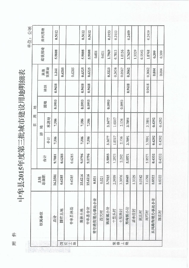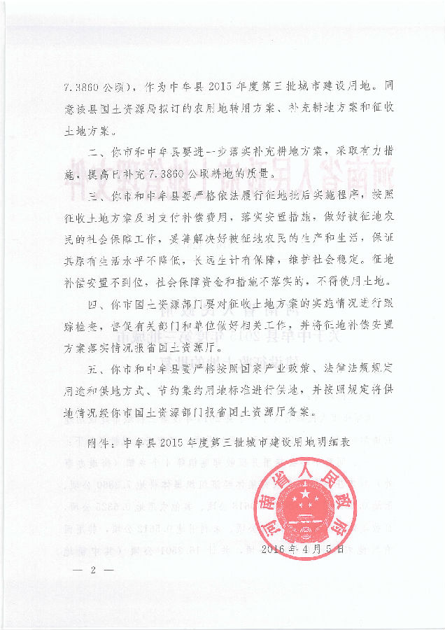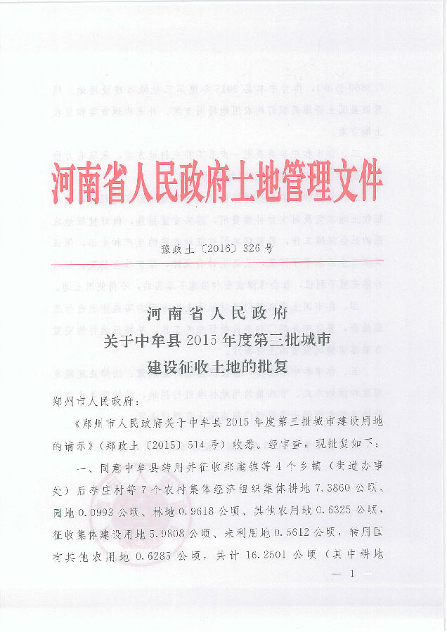 河南省人民政府关于中牟县2015年度第三批城市建设征收土地的批复