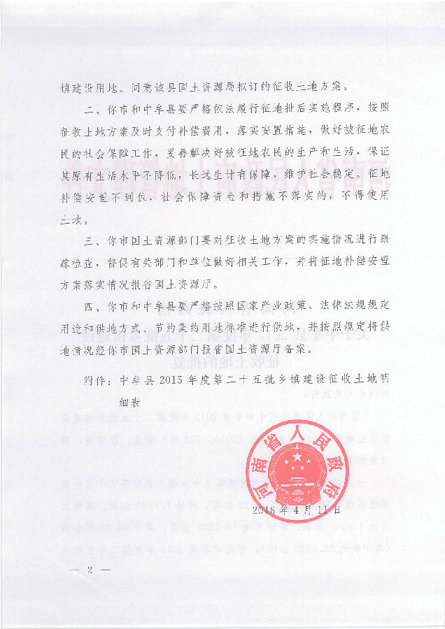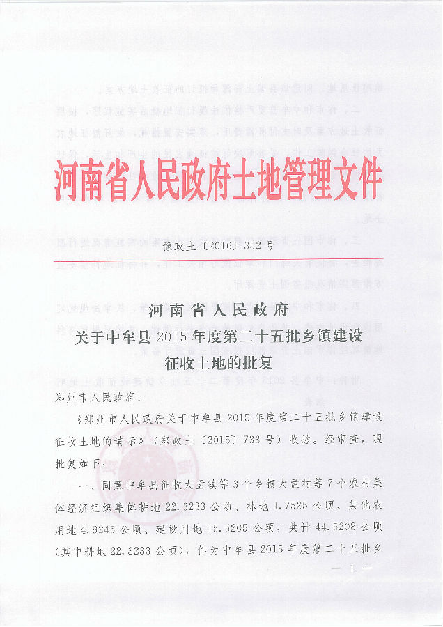河南省人民政府关于中牟县2015年度第二十五批乡镇建设征收土地的批复