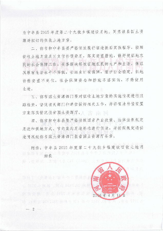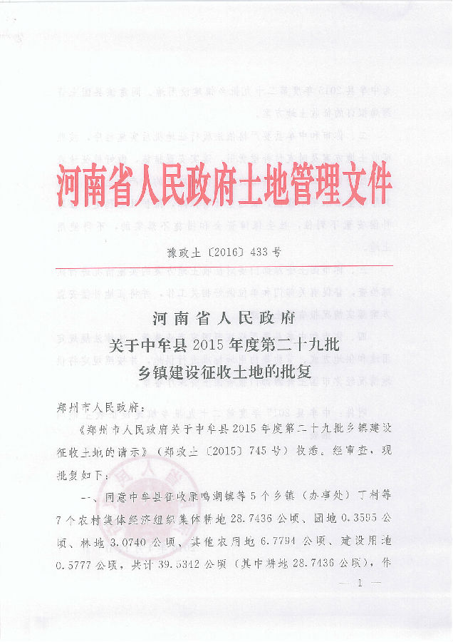 河南省人民政府关于中牟县2015年度第二十九批乡镇建设征收土地的批复