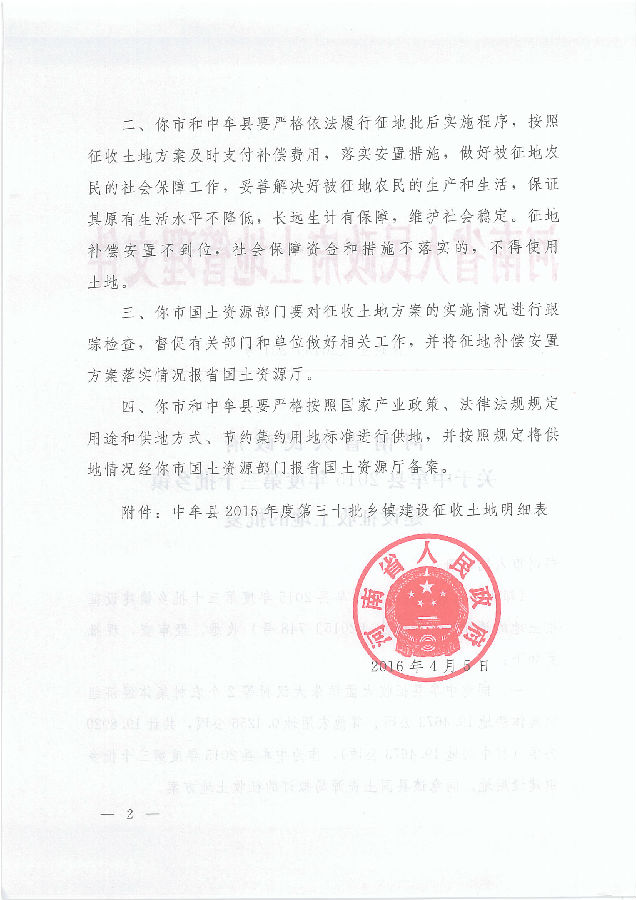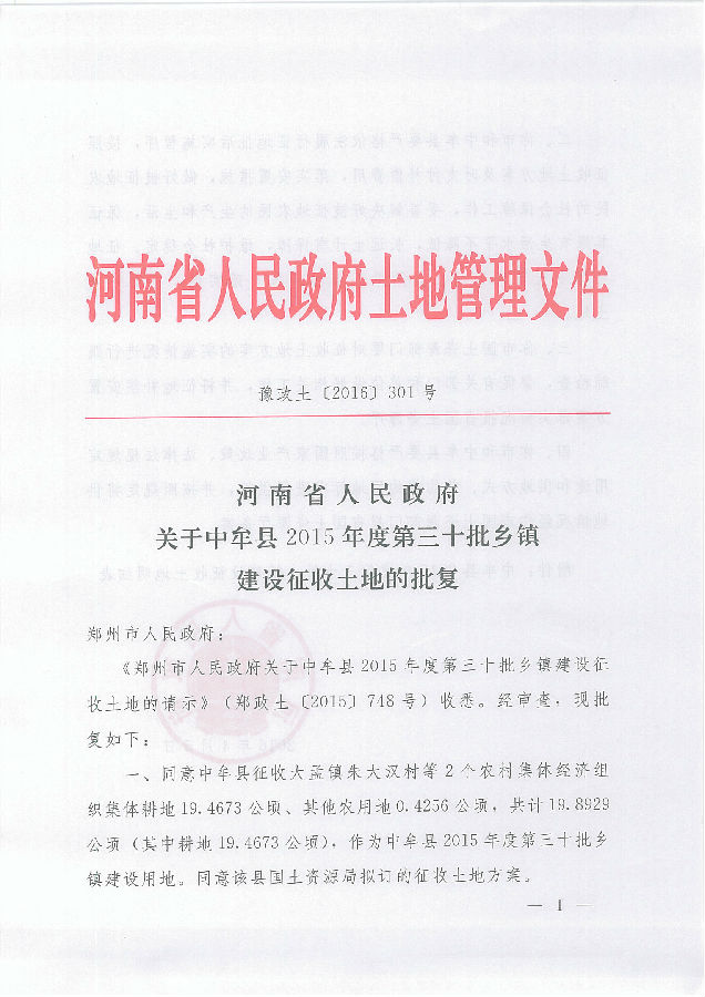 河南省人民政府关于中牟县2015年度第三十批乡镇建设征收土地的批复