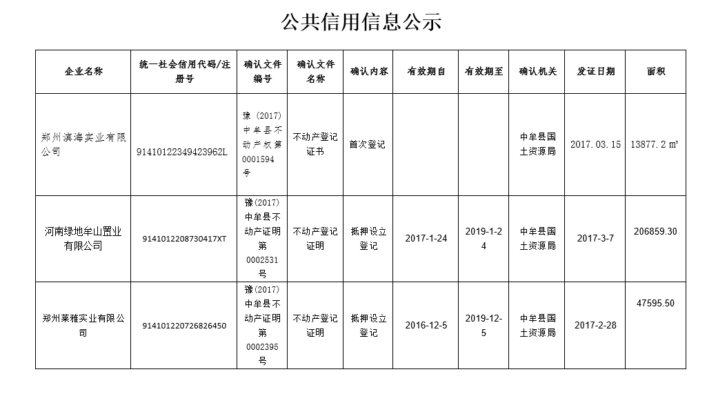 郑州滨海实业、河南绿地牟山置业、郑州莱雅实业有限公司等公共信用信息公示