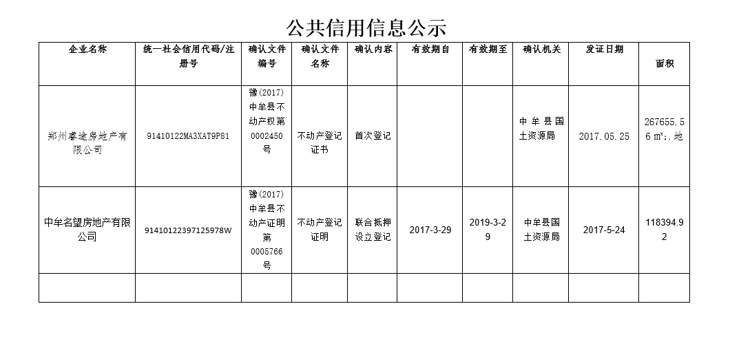 郑州睿途房地产、中牟名望房地产有限公司等公共信用信息公示