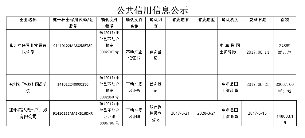 郑州中联置业发展、郑州名门枫杨外国语学校、郑州拓达房地产开发有限公司等公共信用信息公示