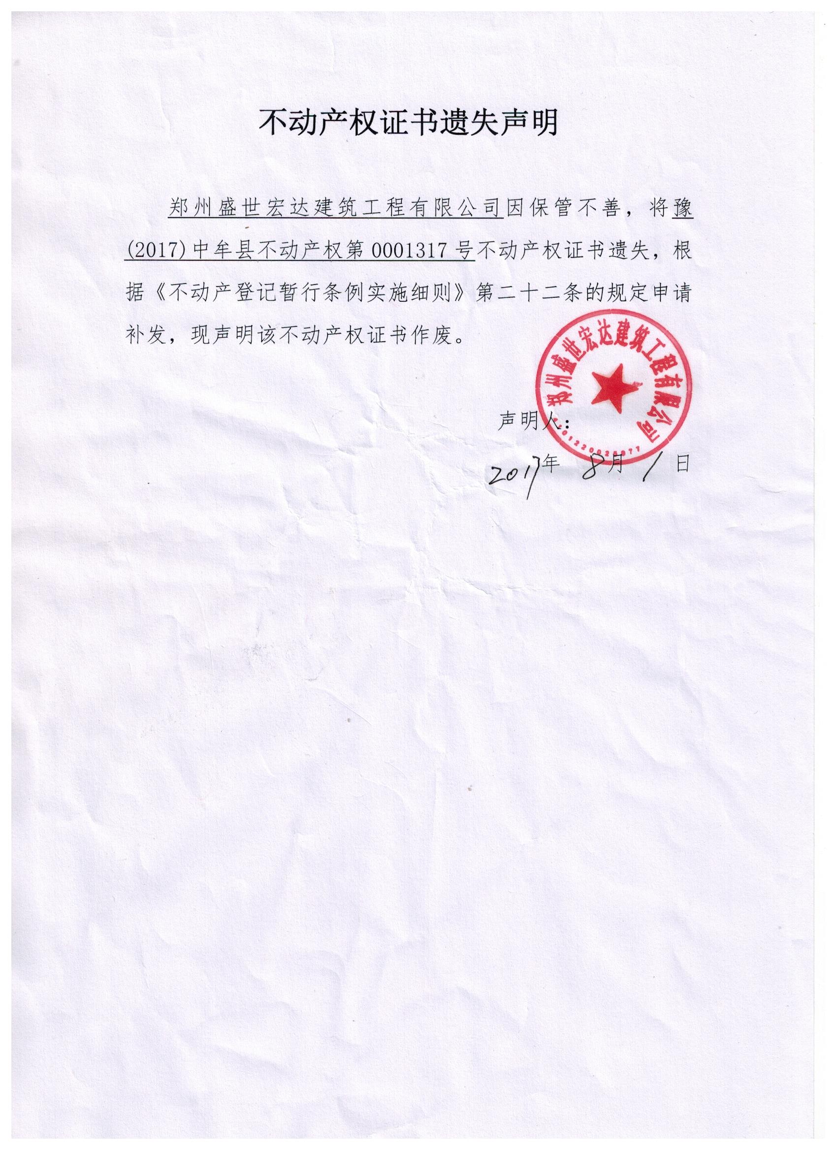 关于郑州盛世宏达建筑工程有限公司不动产权证书的遗失声明
