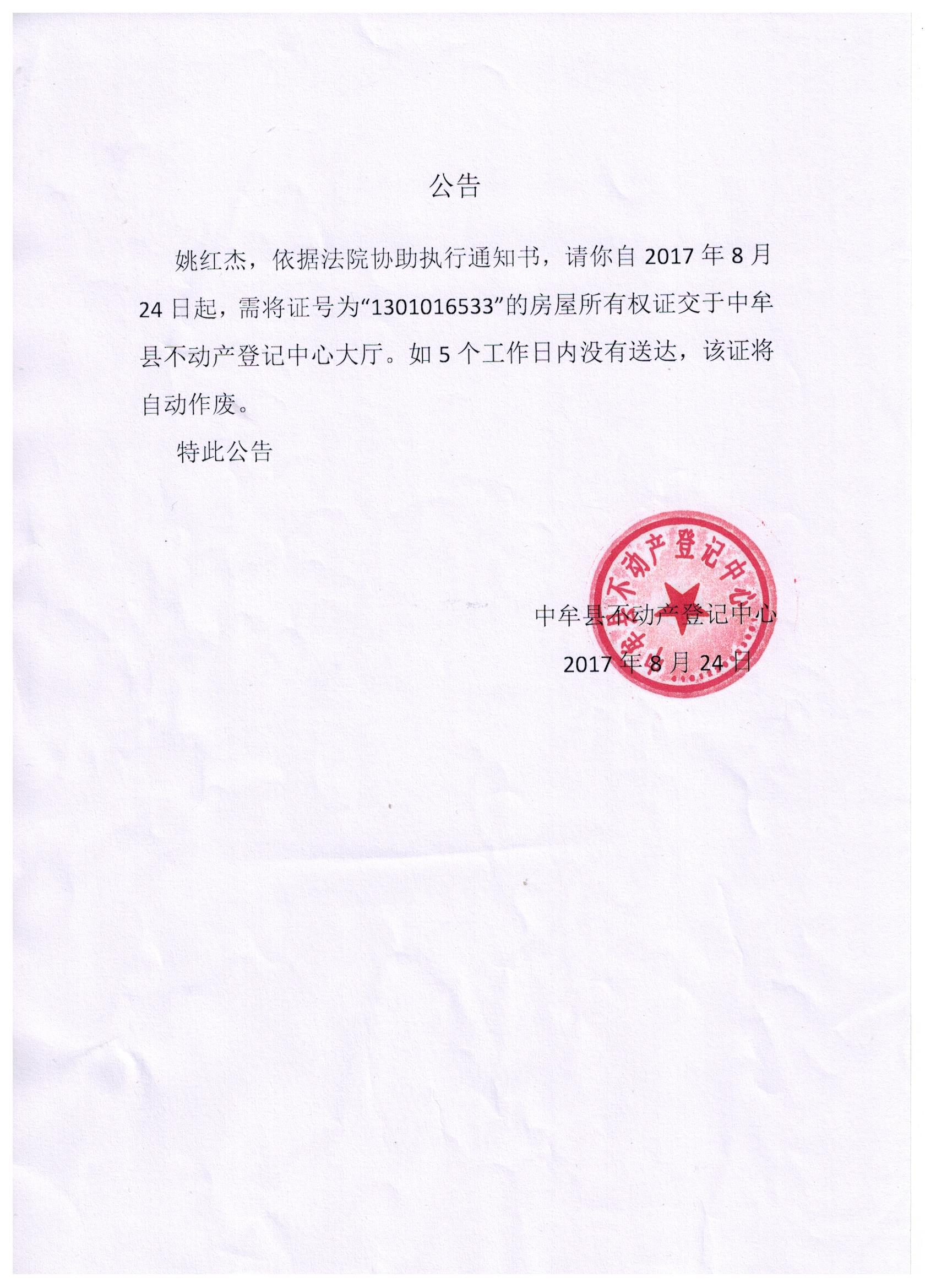 中牟县不动产登记中心关于姚红杰的法院协助执行的公告