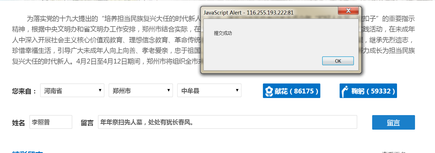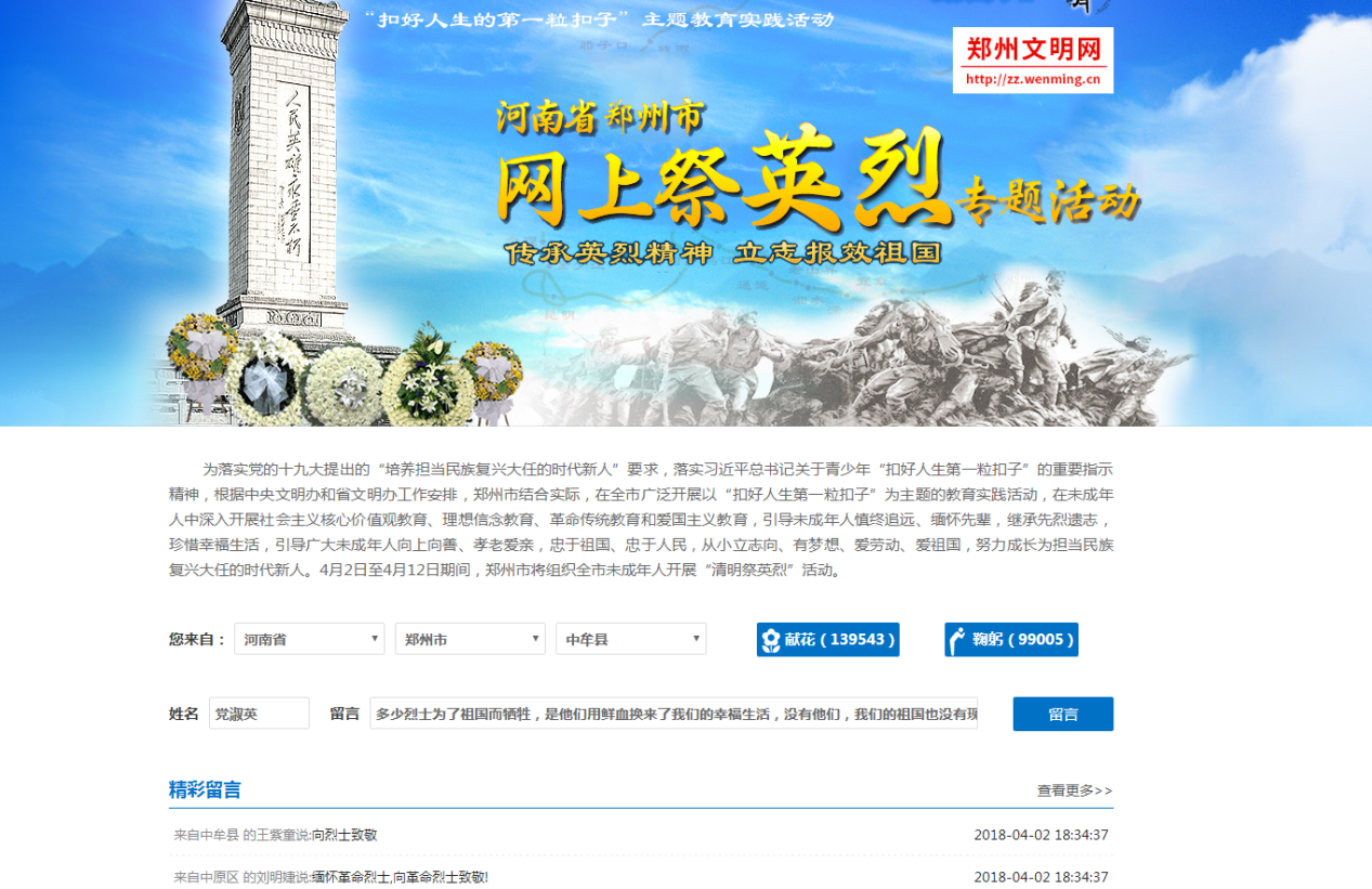 活动中,我中心党员干部职工怀着无比崇敬的心情,登录郑州文明网开设的“网上祭先烈”互动平台,认真浏览网页,了解先烈们的英雄事迹,纷纷进行网上鲜花、拜祭,并在网站上留下自己的祭奠感言,以此表达对先烈、先贤、先人的感恩和敬仰。引导干部们慎终追远、缅怀先辈,铭记历史、学会感恩,继承先烈遗志,珍惜幸福生活,把个人理想追求融入实现中国梦的共同奋斗之中。