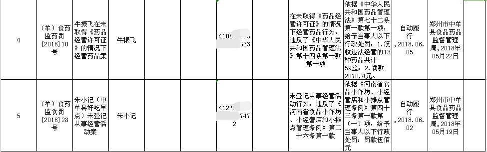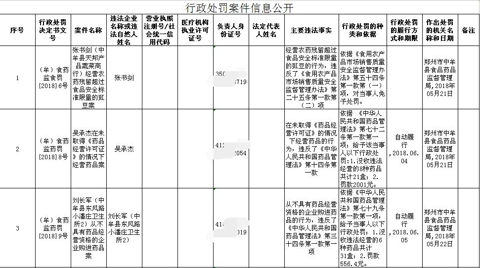 中牟县食品药品监督管理局行政处罚案件信息公开