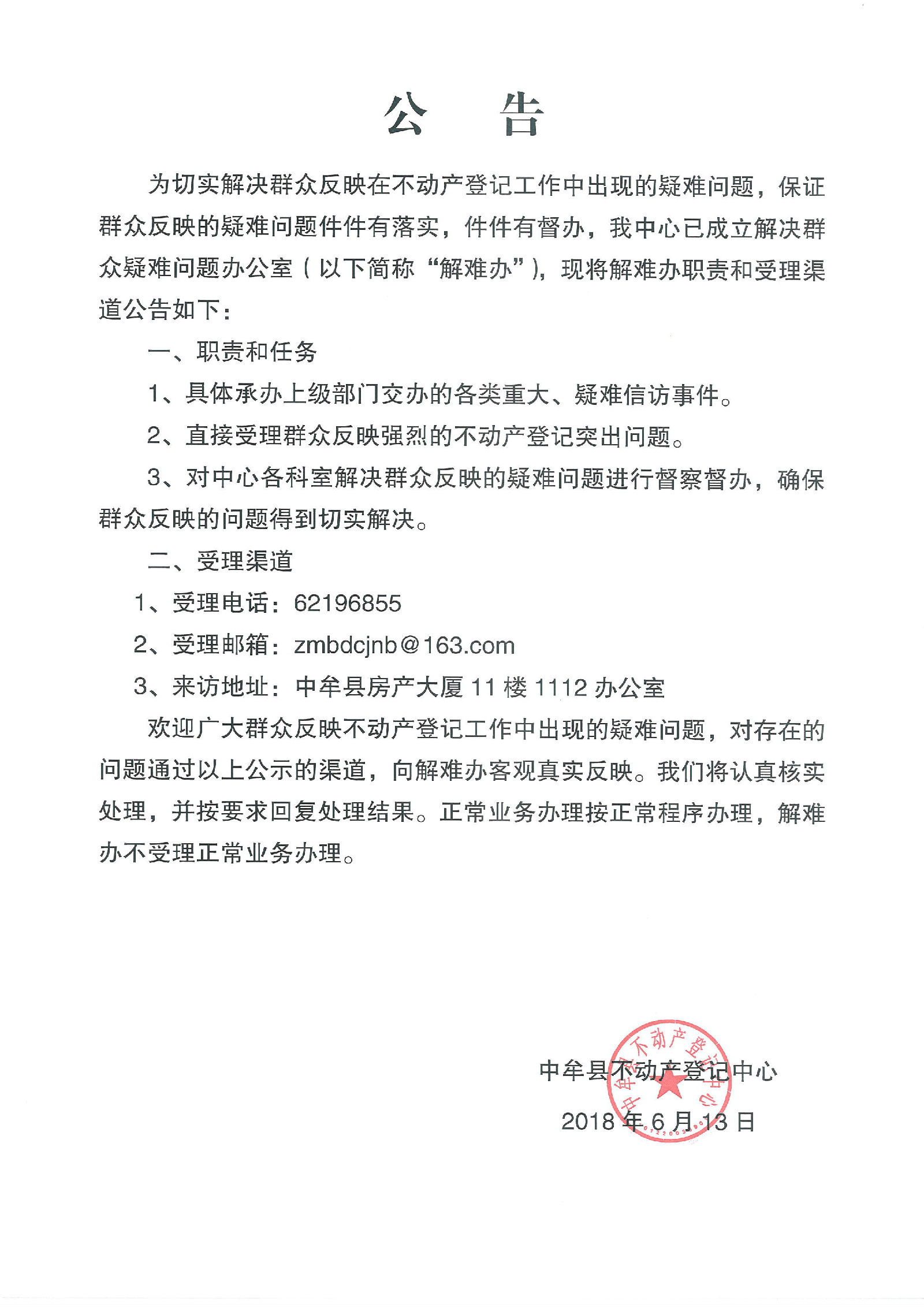 中牟县不动产登记中心解难办职责和受理渠道公告
