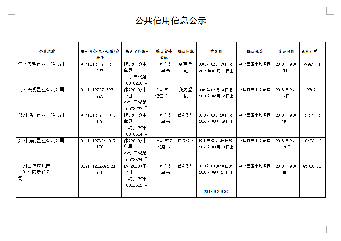 河南天明置业有限公司、郑州顺创置业有限公司等公共信用信息公示