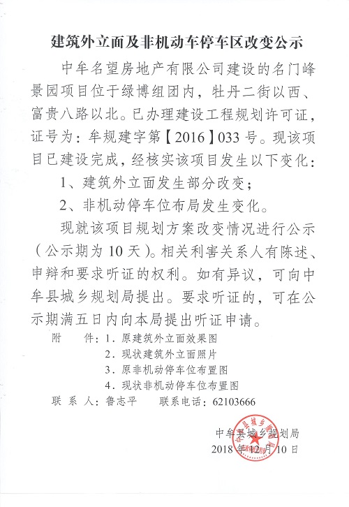 名门峰景园项目建筑外立面及非机动车停车区改变公示