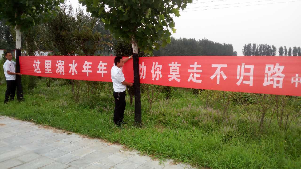 一是组织相关人员在运粮河、黄河滩区、鱼塘地段设置“危险水域、严禁靠近”等警示标志、悬挂防溺水等安全宣传条幅;
